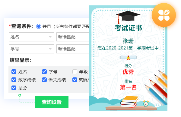 查詢結果頁支持自定義設計,生成成績單、報告單、考試證書等樣式